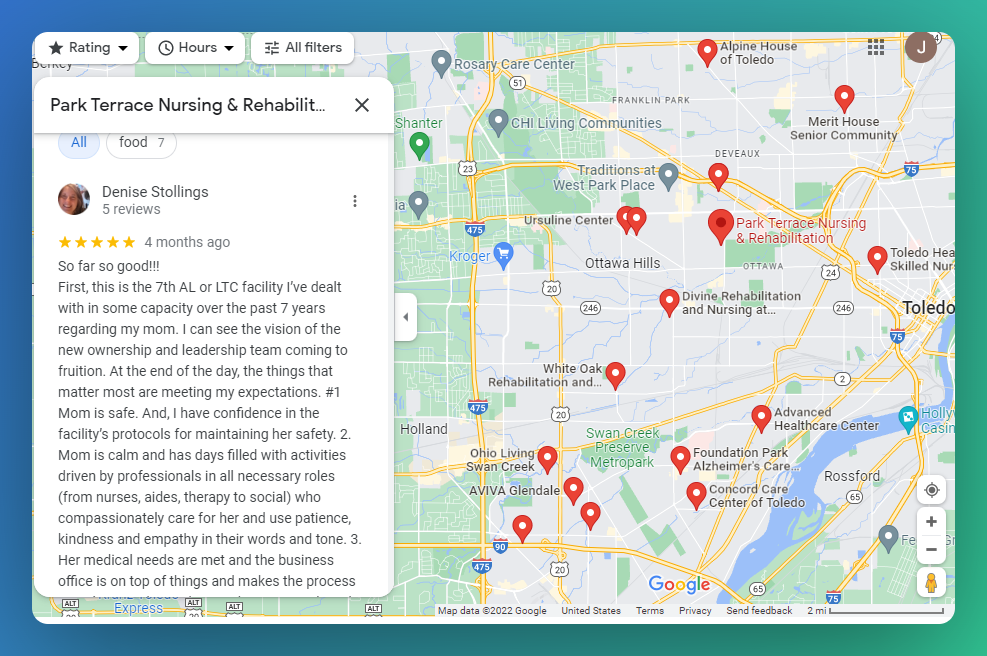 Specific - A unique story or example based review was more likely to rank higher than reviews with generic content. In the example below, this rather long but specific review was listed first by Google.